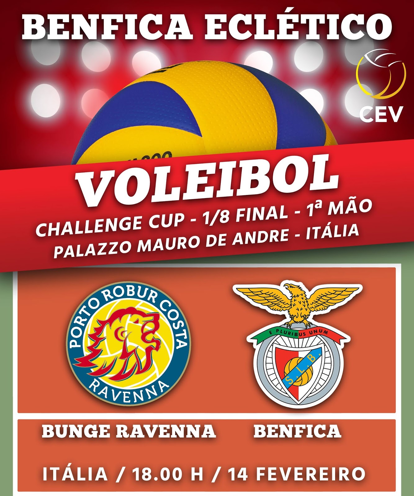 Às 18 horas desta Quarta-feira, o Voleibol encarnado defronta em solo transalpino o Bunge Ravenna, para a 1ª Mão dos Quartos de Final da Challenge Cup. Reencontro entre as duas equipas depois de em 2015 o Benfica ter eliminado a equipa italiana nas Meias Finais desta mesma competição, na altura um resultado que surpreendeu a Europa do Voleibol.